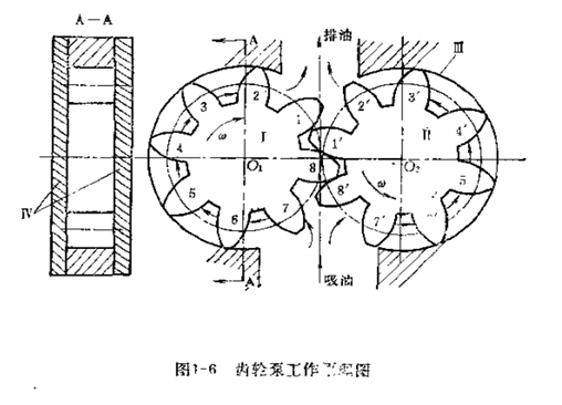 的工作原理也各異(yì)。本節僅敘述具有相同參數(shù)的漸開線外齧(niè)合齒輪油(yóu)泵的工作原理。如圖1-6所示,齒輪油泵主要由兩個相互齧合的齒輪Ⅰ和Ⅱ,以及容納它們的泵體Ⅲ和前後泵蓋Ⅳ所組成。在泵體(tǐ)上,於(yú)齒(chǐ)輪開始和脫離齧合之處,分(fèn)別開有排油口和吸油口。由輪齒6、7 、8 、8'、7'的表麵及泵體的內表麵組成吸油腔,由輪齒1、2、3'、2'、1'的表麵及泵體的內表麵組成壓油腔,兩腔互不相通(tōng)。