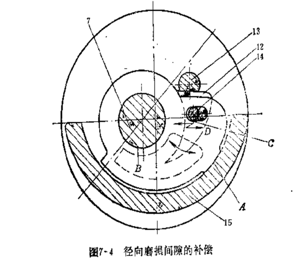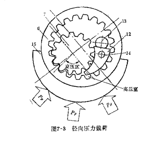 浮動側(cè)板和(hé)小齒輪軸的接觸點B與填隙片的(de)內外(wài)徑(jìng)是(shì)同時磨損的,即點B一經磨(mó)損,浮動側板將以導銷為軸微微轉動,並與徑向半圓支承的接(jiē)觸點(diǎn)一起移動,使得徑向半圓支承又會將(jiāng)內齒環和填隙片推向小齒輪和止動銷。因此,高壓腔的徑向間隙在長期的運轉中能自(zì)動補償(cháng)。
