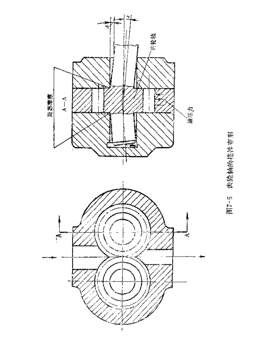 一(yī)般來(lái)說,外齧合齒輪油泵(YCB齒輪油泵、KCB齒輪油泵、2CY齒輪油泵)的齒輪軸在壓力油的(de)作用下,會產生撓性變形。由於支撐齒輪的軸(zhóu)承(chéng)和泵的基體是剛性(xìng)的,所(suǒ)以,齒輪軸和軸承(chéng)將產生偏載荷作用的現象,如圖7-5所示。圖中表示了(le)一般齒輪油泵齒(chǐ)輪軸的撓性變形情況,此偏載作用將會(huì)導(dǎo)致載荷集中於軸承的末端,即發生局部接觸的過渡磨損(sǔn)及發熱(rè),甚至燒傷成二摩擦副抱(bào)軸咬死(sǐ),致使齒輪油泵損壞或使用壽命縮短。