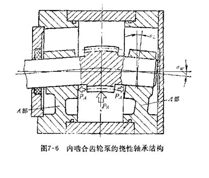 為了避免上述缺陷,IPH型(xíng)內齧(niè)合(hé)齒輪(lún)油(yóu)泵采用了如圖7-6所(suǒ)示(shì)的結構,其技術特點是采(cǎi)用了撓性軸承,它是通過A部與泵體結合(hé),在背(bèi)壓室軸向作用力PA的作用下,可以產生(shēng)aL的撓角變形。而小齒輪軸在油壓力PR的作用下,產生aW 的(de)撓角變形,aW和aL都與排油力成正比。因此,通過正確的(de)設計,使(shǐ)軸承的截麵慣性力(lì)矩產生的軸承撓(náo)角和小齒輪軸的撓角保持(chí)一致,保持撓性軸承與小齒輪軸不會發生局部接(jiē)觸的偏載現象,這_起到了避免剛性支承缺陷的作用。