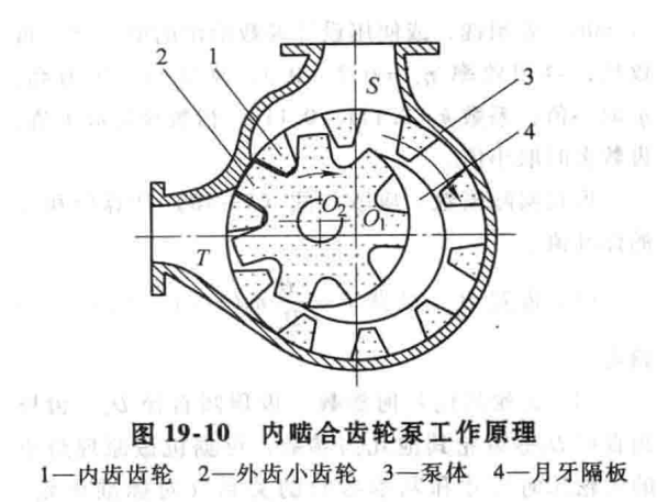 內齧合齒輪泵由內齒齒輪1、外(wài)齒小齒輪2、泵體(tǐ)3和月牙形隔板4組成。當(dāng)主動齒輪2(或1)沿圖示方向O2(或O1)軸心轉動時,便驅動與它齧合的齒輪1(或(huò)2)繞中心O1(或O2)旋轉。進入泵(bèng)吸入室S的輪齒,正好處於逐漸退出齧合的狀態,使(shǐ)吸入(rù)室容積增大,壓力降低,通過泵入(rù)口(kǒu)吸入(rù)液體(tǐ)。進入齒槽的液體,被轉動的輪齒帶到壓出室T。在這裏,輪齒又逐(zhú)漸進入齧合,齒槽被與之齧合的輪齒(chǐ)嵌入,納液(yè)容積減小,壓(yā)力升高,通過排出口將液體壓(yā)出(chū)。月牙(yá)隔板4位於外齒小齒輪和內齒齒輪(lún)之(zhī)間,用以將泵的吸入室與壓出(chū)室(shì)隔開。