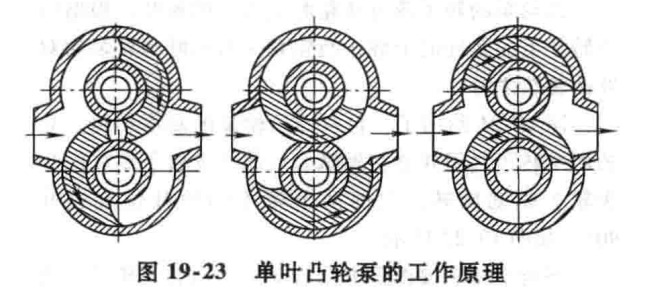 對單葉凸輪泵,其工作原(yuán)理與雙葉凸輪泵相仿,其差別是單葉凸輪泵的每個(gè)轉子上(shàng)有一個輪葉,於(yú)是整個泵_隻有兩個(gè)槽腔輪流進行吸、排液,如圖19-23所(suǒ)示。