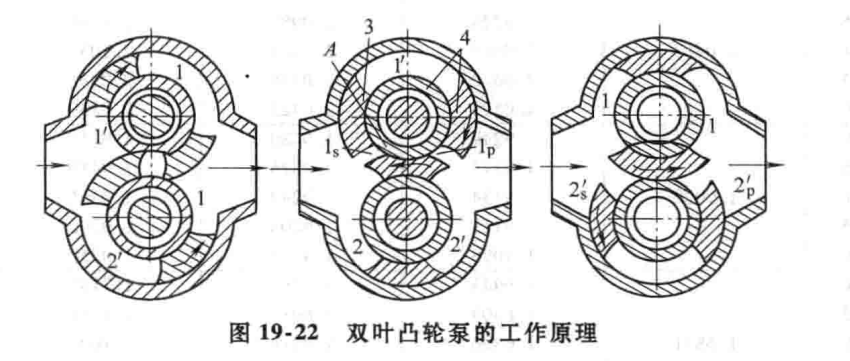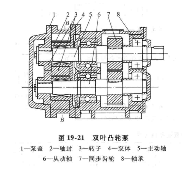 19-21給(gěi)出了一台(tái)雙葉凸輪泵的基本結構(gòu)。它的兩個轉(zhuǎn)子之間並不(bú)接(jiē)觸齧合,故從動轉子要靠同步齒輪7驅動旋轉,它的兩個轉子的輪葉位置(zhì)錯開90°如圖(tú)19-22所示。