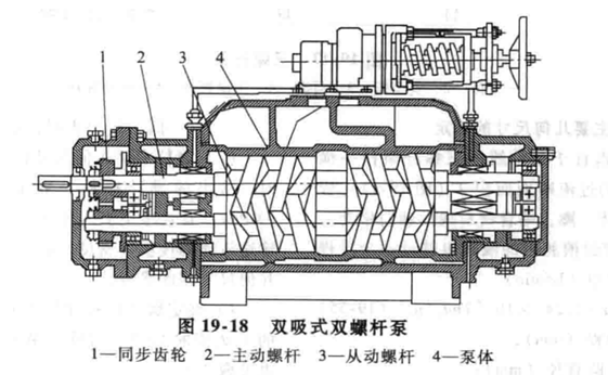 19-18給出的(de)是一台不(bú)密閉雙吸式雙螺杆泵。它的(de)泵體內裝有兩根左、右旋單頭螺紋的螺(luó)杆,主動螺杆(gǎn)2由動力機驅動轉動時(shí),靠同步齒輪1帶動從動(dòng)螺杆3轉動,兩根螺杆(gǎn)以及螺杆與泵體4之間存在著間隙。其間隙大小,取決於輸送(sòng)介質的性質、工作壓力等因素。由於每根螺杆兩(liǎng)端螺紋的旋向相反,螺杆轉動時(shí),由螺杆齧(niè)合線形成的泵工作腔,從位於螺杆兩端的泵吸入室(shì),逐(zhú)漸向位於螺杆中部的壓出室移(yí)動(dòng)。