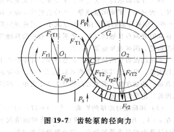 在圖19-7上給出了沿齒輪外(wài)圓周方(fāng)向液體壓力(lì)不均勻分布(bù)的近似狀況。泵吸(xī)入室區域內齒輪外圓周(zhōu)受均勻的低壓Ps作用,排出室區域受均布的高壓Pp作用,在從(cóng)吸(xī)入到(dào)排出室沿齒輪外緣表麵與(yǔ)泵殼內圓柱(zhù)表麵之間(jiān)的過渡區內(nèi),壓力由Ps逐漸升至Pp。可以推斷,主動(dòng)齒輪(lún)和從動齒輪要分別受到一個大小(xiǎo)相近、方向皆大(dà)致從(cóng)泵排出室指向吸入室的徑向液壓(yā)合力Frp1和Frp2的作用。